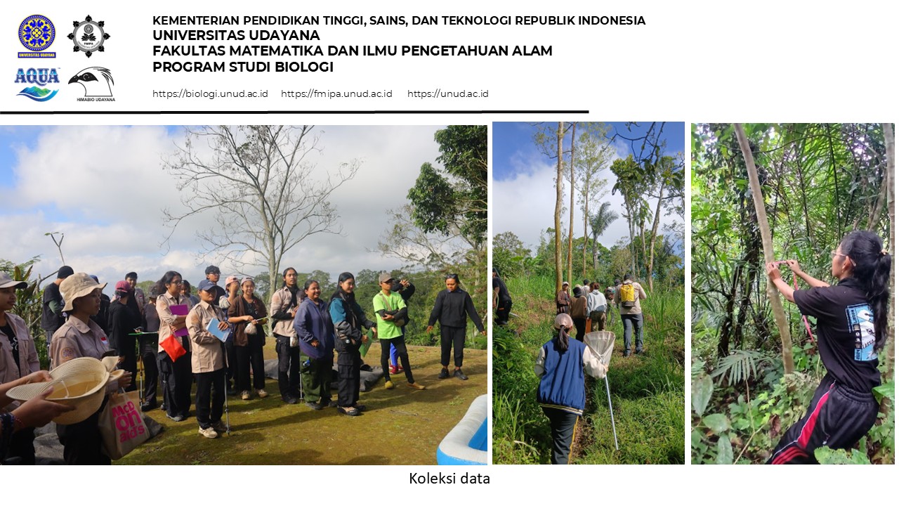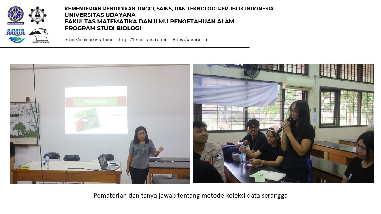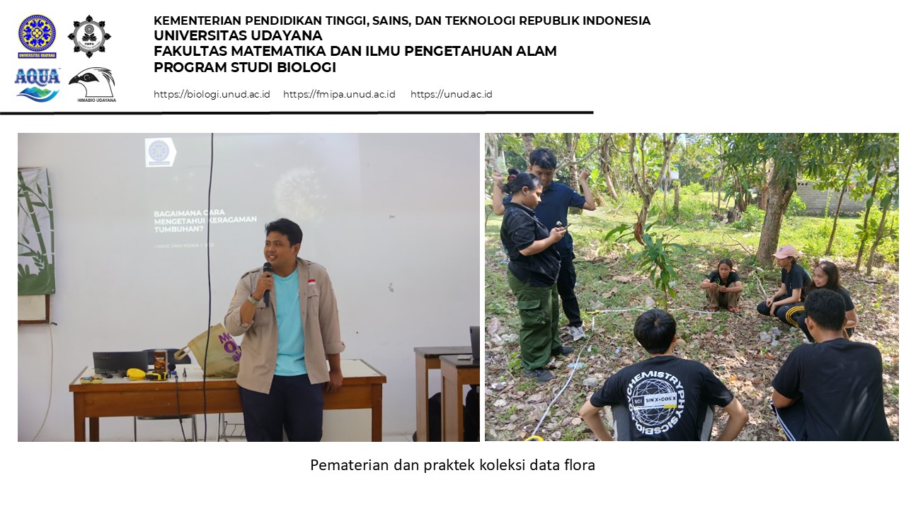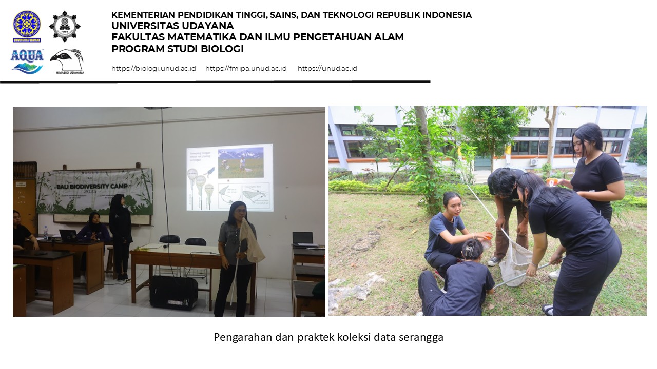The flora and fauna data collection workshop was held on the Biology Study Program campus of FMIPA Udayana with 25 participants over two days. On the first day, the workshop began with opening remarks from the 2025 Himabio chairperson, Ida Ayu Putu Oka Apsari Widya Putri, followed by an official opening by the Coordinator of the Biology Study Program, Prof. Dr. I Ketut Ginantra, S.Pd., M.Si. After the opening, the first session focused on insect data collection, delivered by Dr. Ni Made Suartini, S.Si., M.Si, and followed by practical activities using sweep nets and insect preservation techniques. The first day concluded with an evaluation of the collected data and notes on areas for improvement.